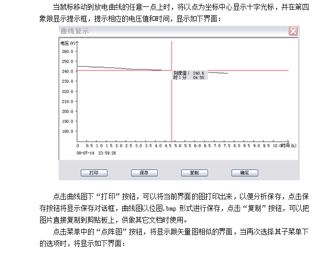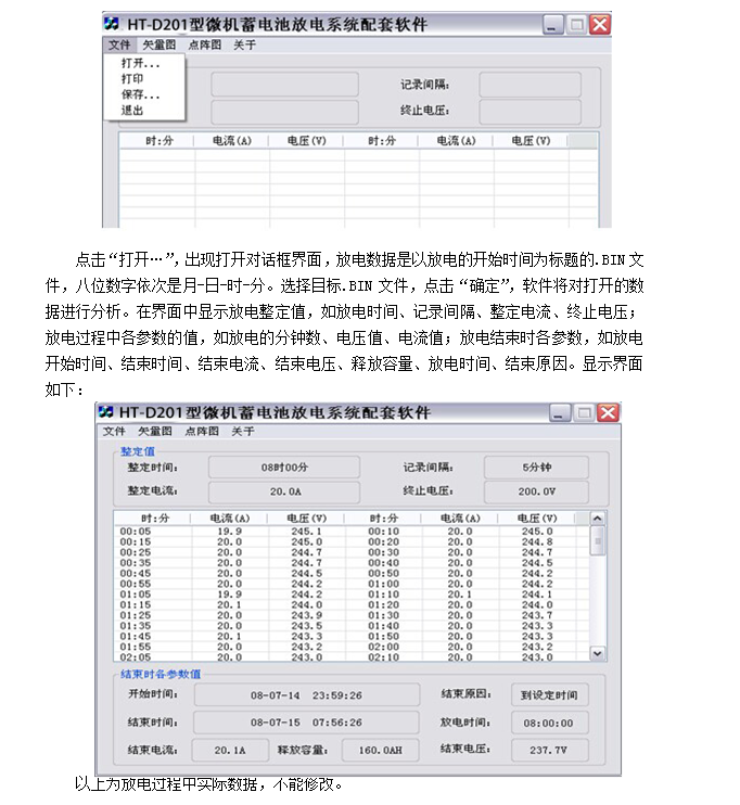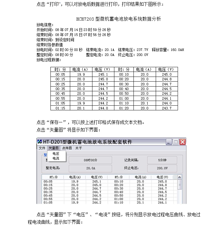 5.5 記錄放電過(guò)程的電流電壓值(每5分鐘一筆),供事后分析查閱。放電數(shù)據(jù)可通過(guò)U盤(pán)上傳至電腦,使用配套軟件對(duì)其進(jìn)行全面分析,數(shù)據(jù)可以以報(bào)表、圖形等形式顯示,并可通過(guò)打印機(jī)打印數(shù)據(jù)及圖形,方便用戶查閱和整理。