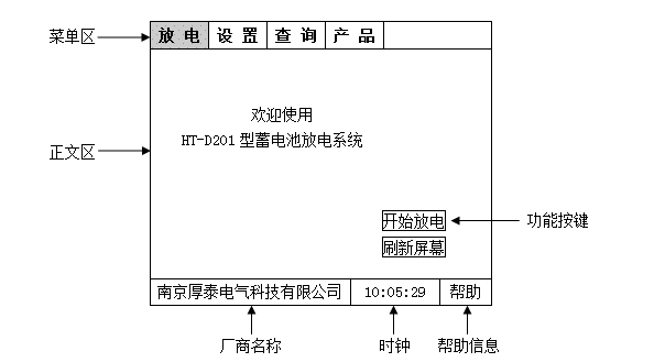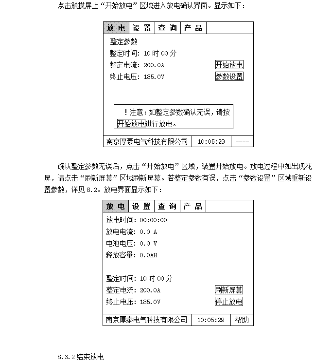 菜單區(qū):放電—放電界面,在參數(shù)設(shè)定完畢后,點(diǎn)擊“開(kāi)始放電”進(jìn)入放電狀態(tài);